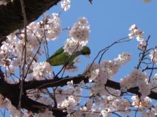 店の前の桜が満開に成りました。緑のインコが来てかじって遊んでいます。